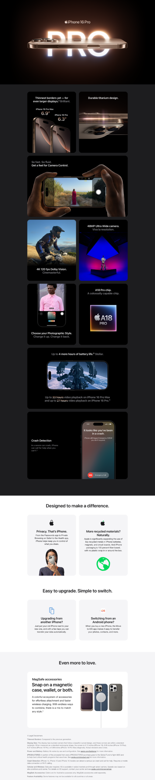 - STUNNING TITANIUM DESIGN—iPhone 16 Pro Max has a strong and light titanium design with a larger 6.9-inch Super Retina XDR display. It’s remarkably durable with the latest-generation Ceramic Shield material that’s 2x tougher than any smartphone glass.