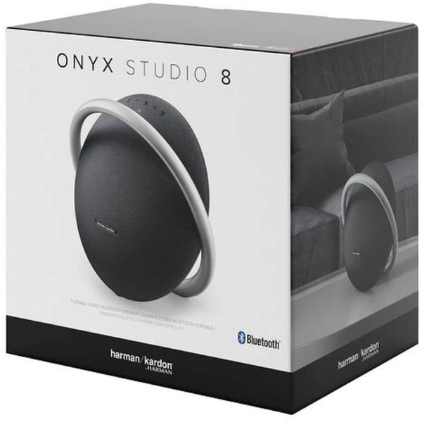 - Bluetooth Streaming for Up to 8 Hours The Onyx Studio 8 pairs seamlessly with any Bluetooth device for enhanced, extraordinary audio. And since music is meant to be shared, you can switch your playlists with anyone by simultaneously connecting two devices to the speaker. With 8 hours of battery time and no power cord tying you down, you can place the Onyx Studio 8 anywhere and get on with the music.