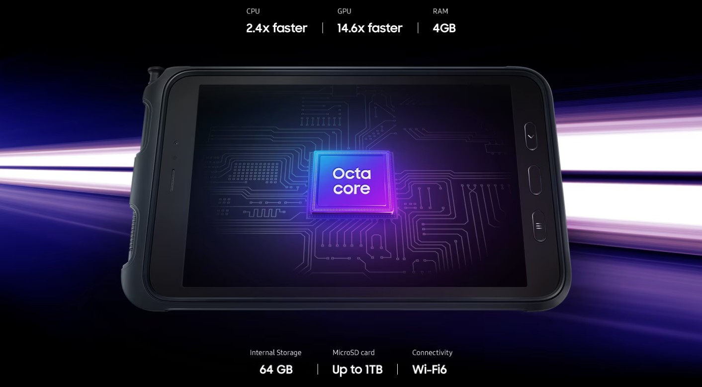 Description for Samsung Galaxy Tab Active3 Tablet, 8″ WUXGA PLS TFT LCD Display, 4GB RAM, 64GB Storage, Exynos 9810 (10 nm) Chipset, 5050 mAh